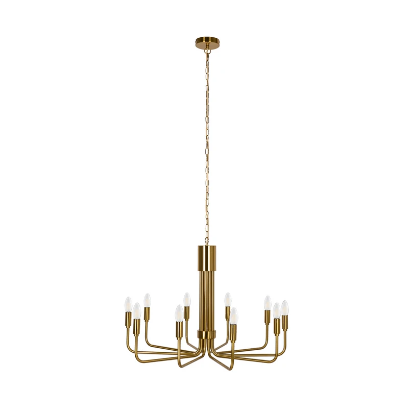 Elanova 10 Chandelier Brass is a modern reinterpretation of the classic chandelier concept. The solid chain suspension, the shiny brass finish that characterises the frame and the many light sources beautifully arranged around the centre of the frame in a fountain formation all bear the same elegance that characterises classic chandeliers. However, the design has been kept relatively low on detail, so the focus is instead on the pure forms. The many curves, twists and arcs are deliberately omitted for a minimalist and contemporary look.