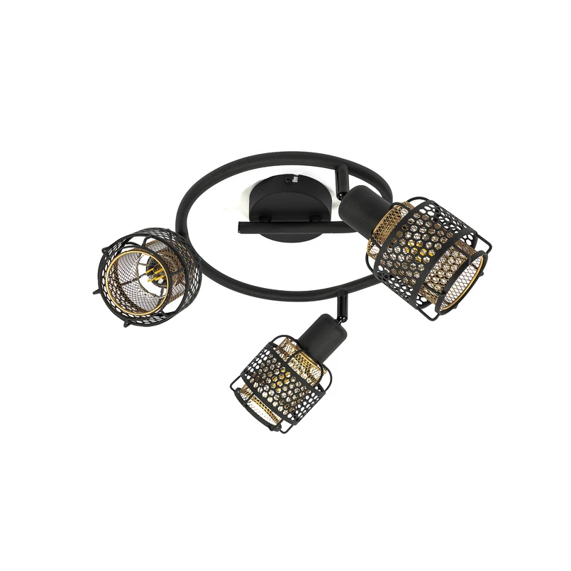Eudoria Black/Gold 3 Round Ceiling Light convinces with its aesthetic and exciting design that both enhances the look of the lamp and provides practical lighting. The frame has a solid black surface. However, the lampshades are a mix of black and gold: each lampshade has an outer and an inner part shaped like a net in a ring around the light source. The outer mesh is black and matches the frame and bracket. The inner mesh has a premium gold finish and is slightly more tightly meshed to protect the light source from glare. The combination of black and gold is very popular in lamp design and has a stylish impact, while the golden inner shade also adds a warm tone to the light when switched on.