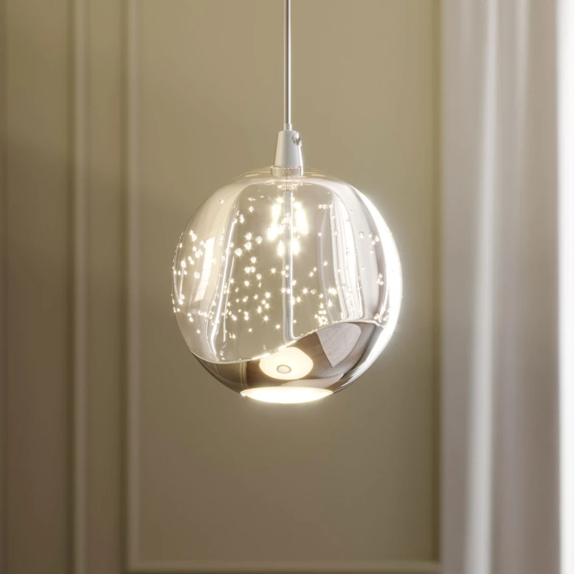 The Hayley 1 Pendant Light Ø9 Clear/Chrome is a stunningly beautiful piece of modern design art that makes a lasting impression. The pendant lamp is designed as a glass sphere with a shiny, floating metal part at the bottom that matches the ceiling fitting. The pendant cord is relatively long, drawing attention to the harmonious design that adds a unique aesthetic to the room. The pendant lamp thus serves not only as lighting but also as a decorative cosy diffuser.