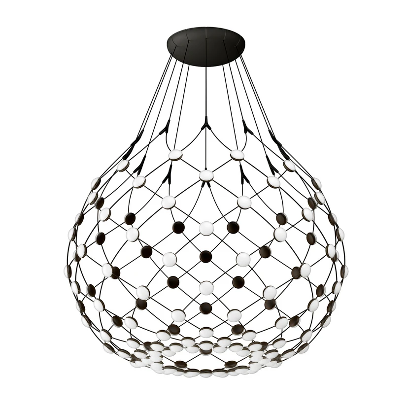 Mesh Pendant Ø80xH60 3m w/Wireless Kit Black from Luceplan is a pendant light that combines elegance and innovation. Made of metal and polycarbonate, this black lamp has an impressive diameter of 80 cm and a height of 60 cm, making it a dramatic centrepiece in any room. With its almost transparent structure of flexible cables and LED light sources strategically placed at the intersections, it creates a unique lighting experience. The built-in Wireless Kit feature allows you to control the light via the Luceplan Mesh app, giving you full control over the lighting. The Mesh lamp is also compatible with the Casambi system, making it easy to integrate into a larger lighting design. Whether you want subtle lighting or a dramatic effect, this light offers a range of light settings that can be customised to your needs.